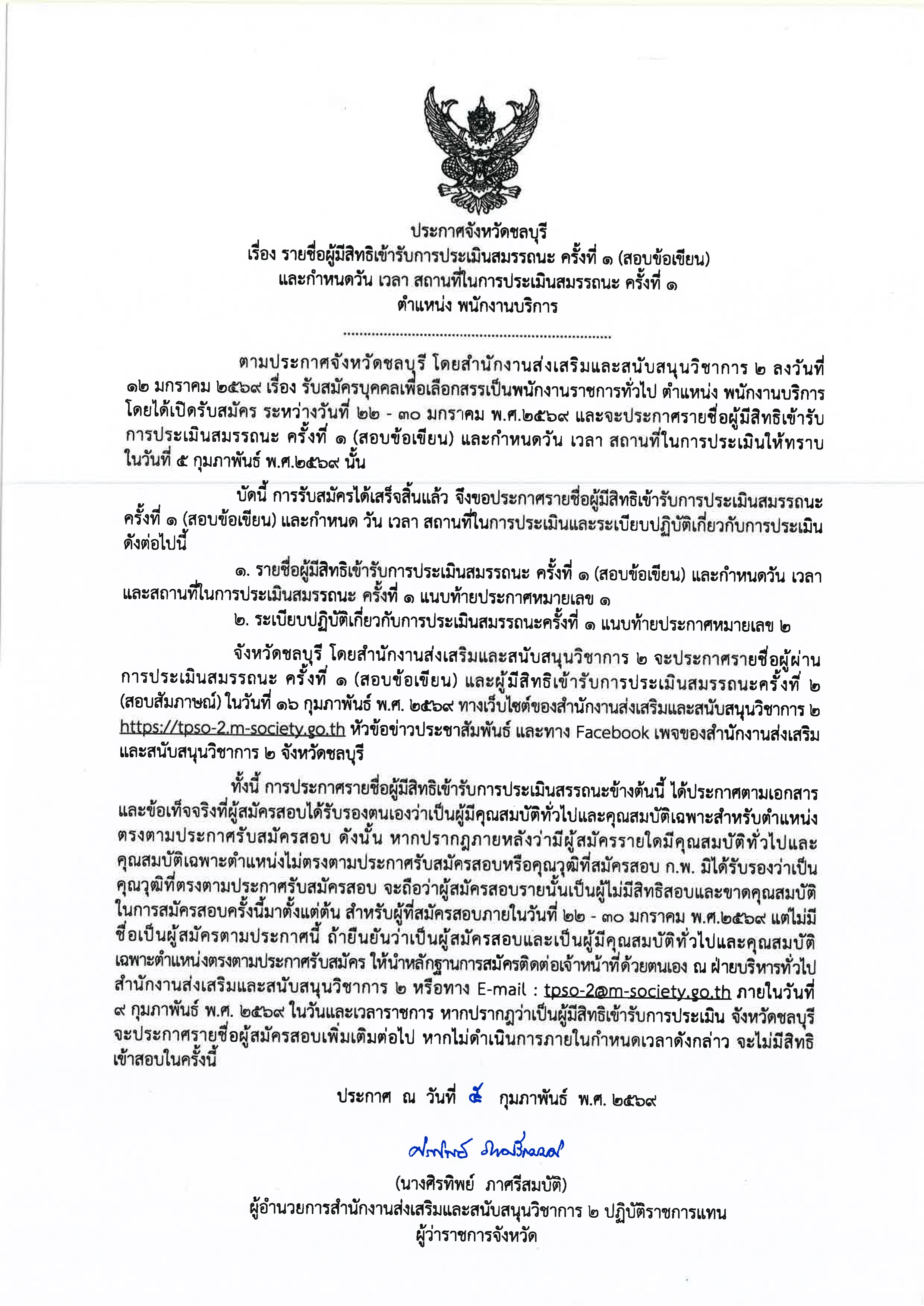 ประกาศจังหวัดชลบุรี เรื่อง รายชื่อผู้มีสิทธิเข้ารับการประเมินสมรรถนะ ครั้งที่ 1 (สอบข้อเขียน) และกำหนดวัน เวลา สถานที่ในการประเมินสมรรถนะ ครั้งที่ 1